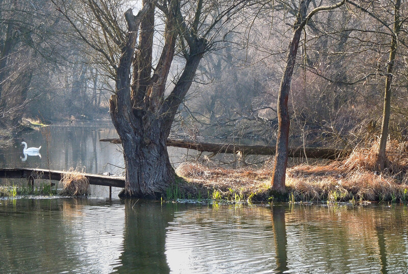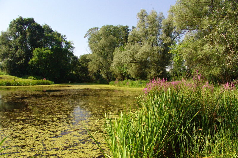Slepé rameno Moravy s vodní flórou a faunou.